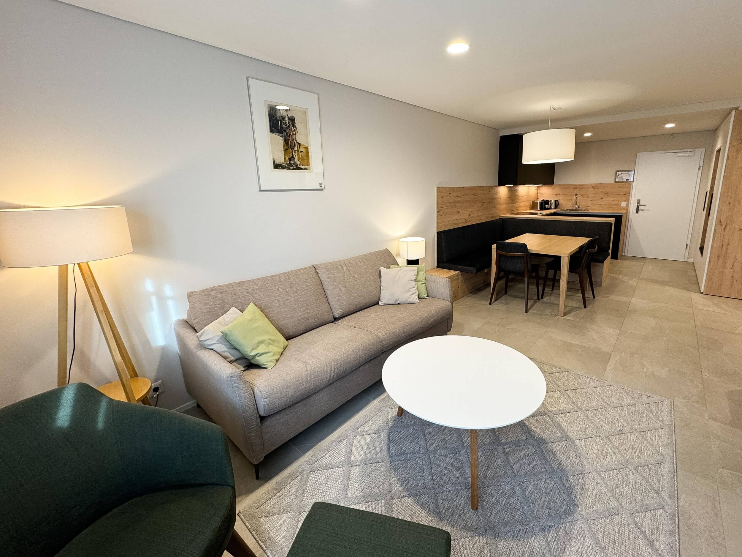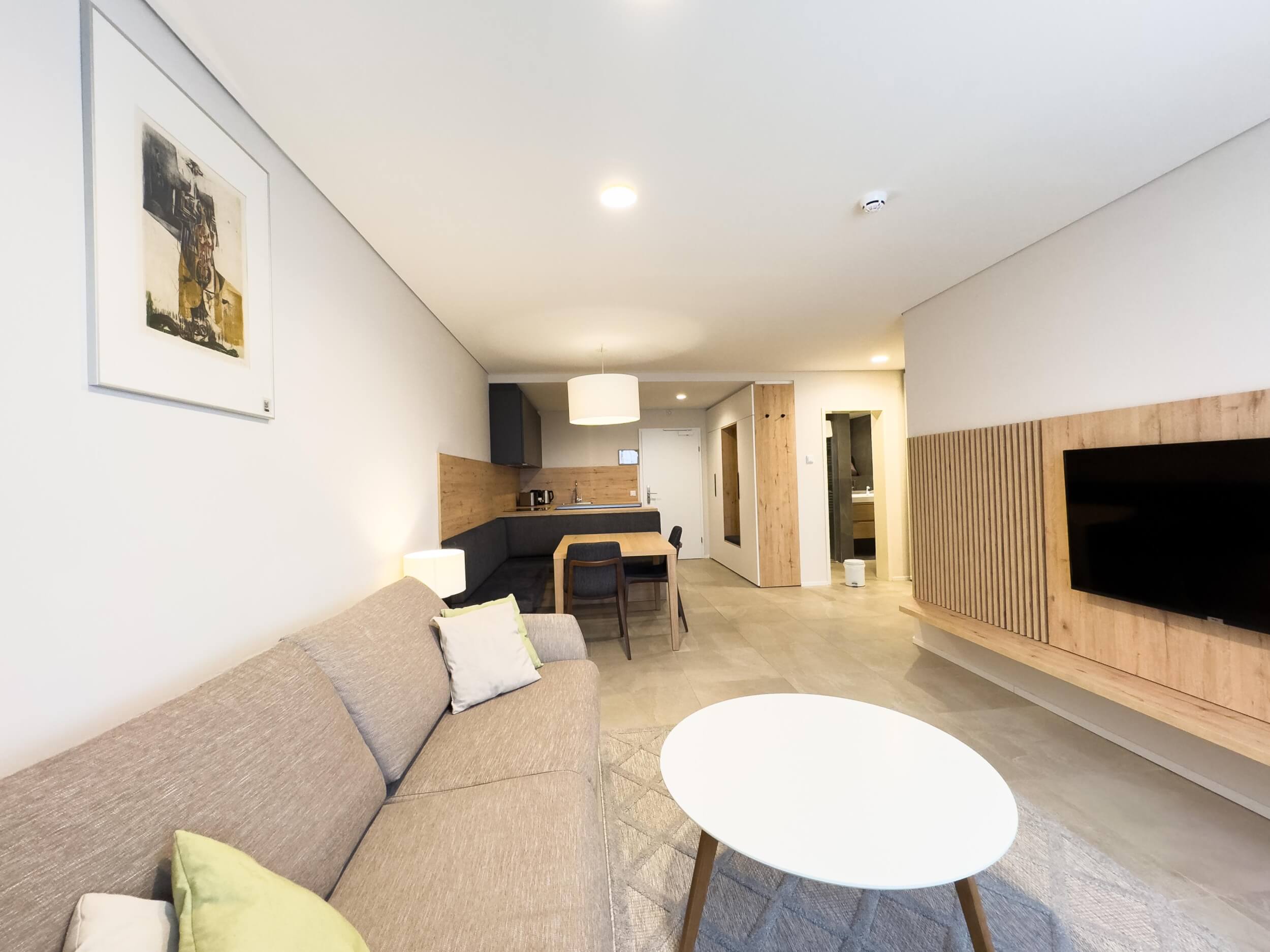 Dieses helle Apartment überzeugt durch einen offenen Koch- und Wohnbereich, der neben gemütlichen Stunden auch Platz für zwei weitere Schlafgäste bietet. Ein separates Zimmer sowie die sonnige Terrasse schaffen Rückzug und Freiraum für modernes Wohnen im kompakten Design.
